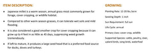 Japanese Millet typically grows 3–4 feet tall and, once fully mature, produces seed heads that serve as a valuable food source for pheasants, doves, turkey, and ducks. Warm soil conditions are required when planting, so be sure to wait until soil temperatures are at least 65 degrees Fahrenheit or higher.